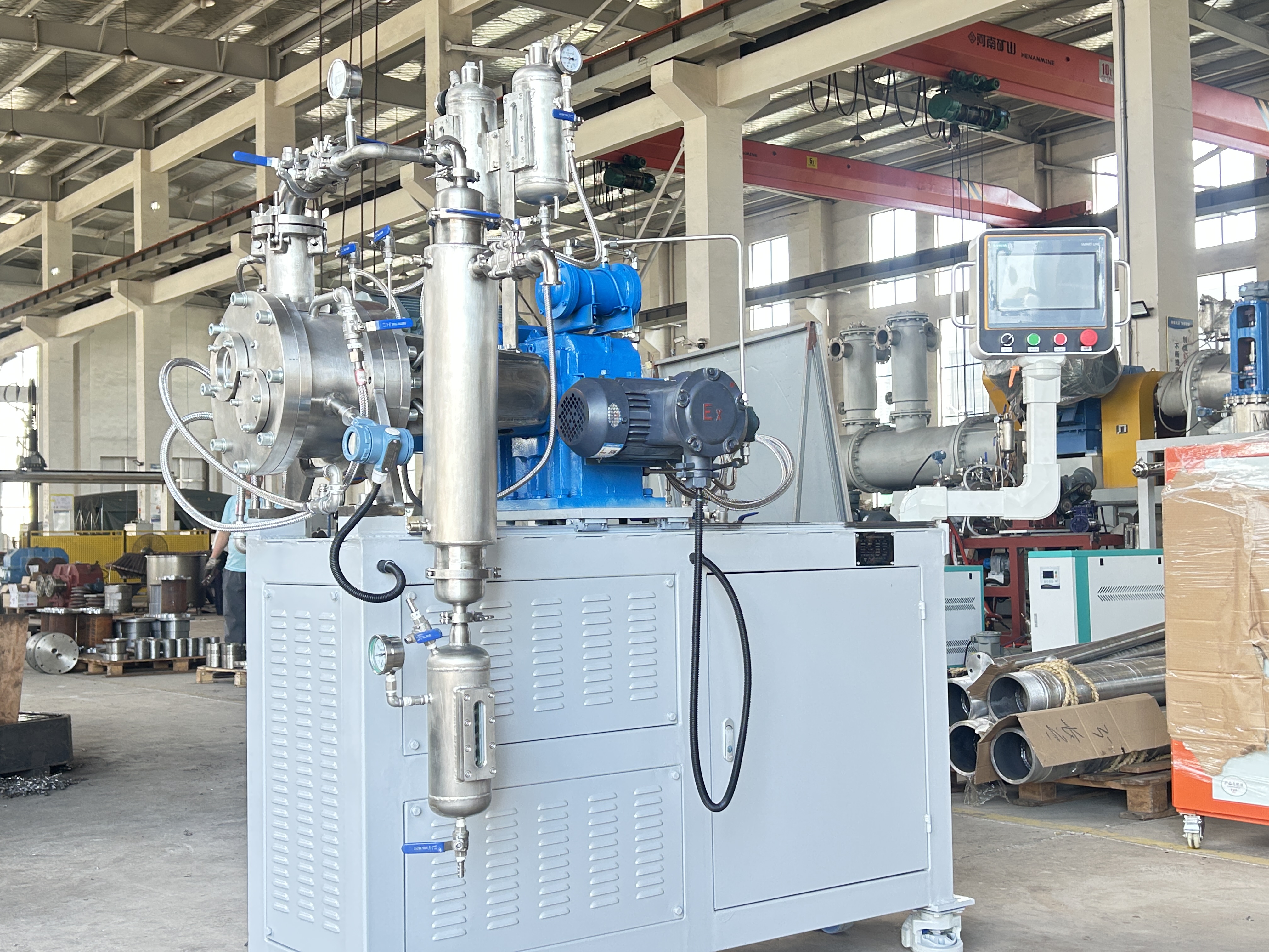.混合機(jī)除夾套有傳熱功能,其主要的傳熱單元還是攪拌軸和攪拌盤,攪拌軸和槳盤中間設(shè)計(jì)是空心的,能通入0-300℃?zhèn)鳠峤橘|(zhì)循環(huán),加上攪拌軸的旋轉(zhuǎn),單位時間內(nèi)物料接觸換熱面積增加,使該混合設(shè)備具有高效的傳熱能力.是高粘流體物料反應(yīng),蒸發(fā),干燥,脫輝的首選裝置。