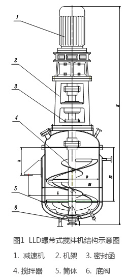 LLD系列螺帶式攪拌機結構如圖1所示,主要由擺線減速機、機架、密封函、攪拌器、筒體、底閥等組成。