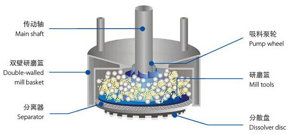 適用介質(zhì):液——液;液——固.一種濕法研磨機(jī),廣泛應(yīng)用于涂料、油墨、色漿、染料等行業(yè),可以實(shí)現(xiàn)超細(xì)化研磨。 自吸葉輪高速吸料→研磨籃內(nèi)極細(xì)的研磨→分散盤高速旋轉(zhuǎn)產(chǎn)生分散、混合、循環(huán)效應(yīng)→由此形成吸料、研磨、出料的高效率循環(huán),解決了物料翻動(dòng)的難題,避免循環(huán)死角,短時(shí)間內(nèi)可得到出色的研磨效果。