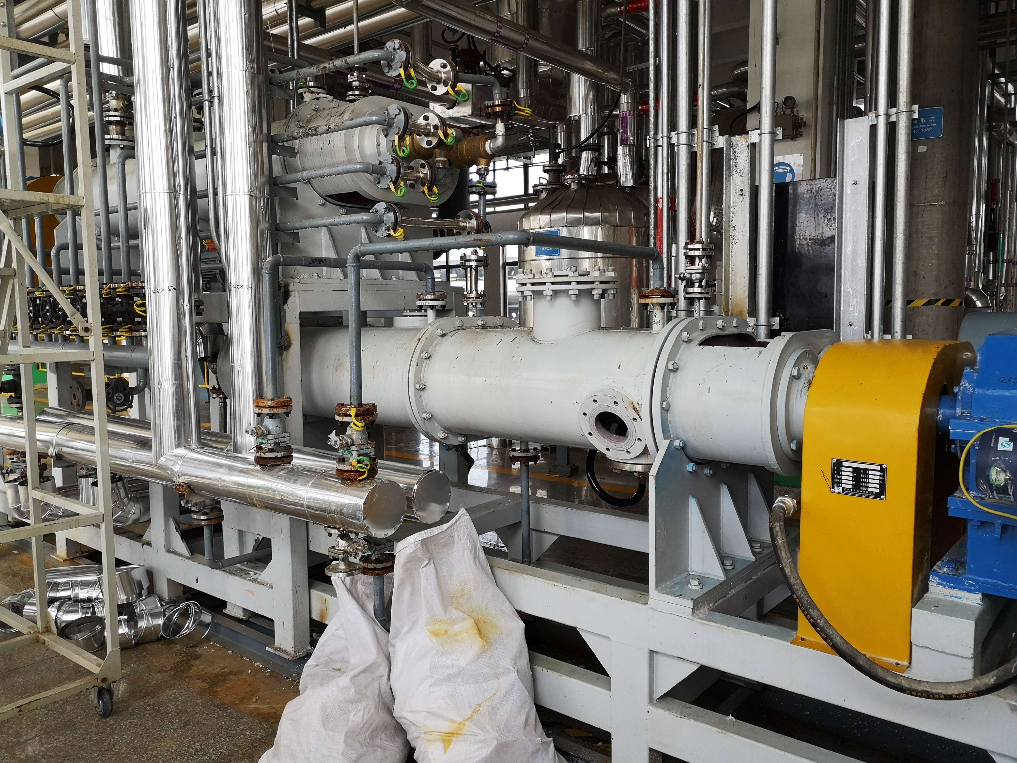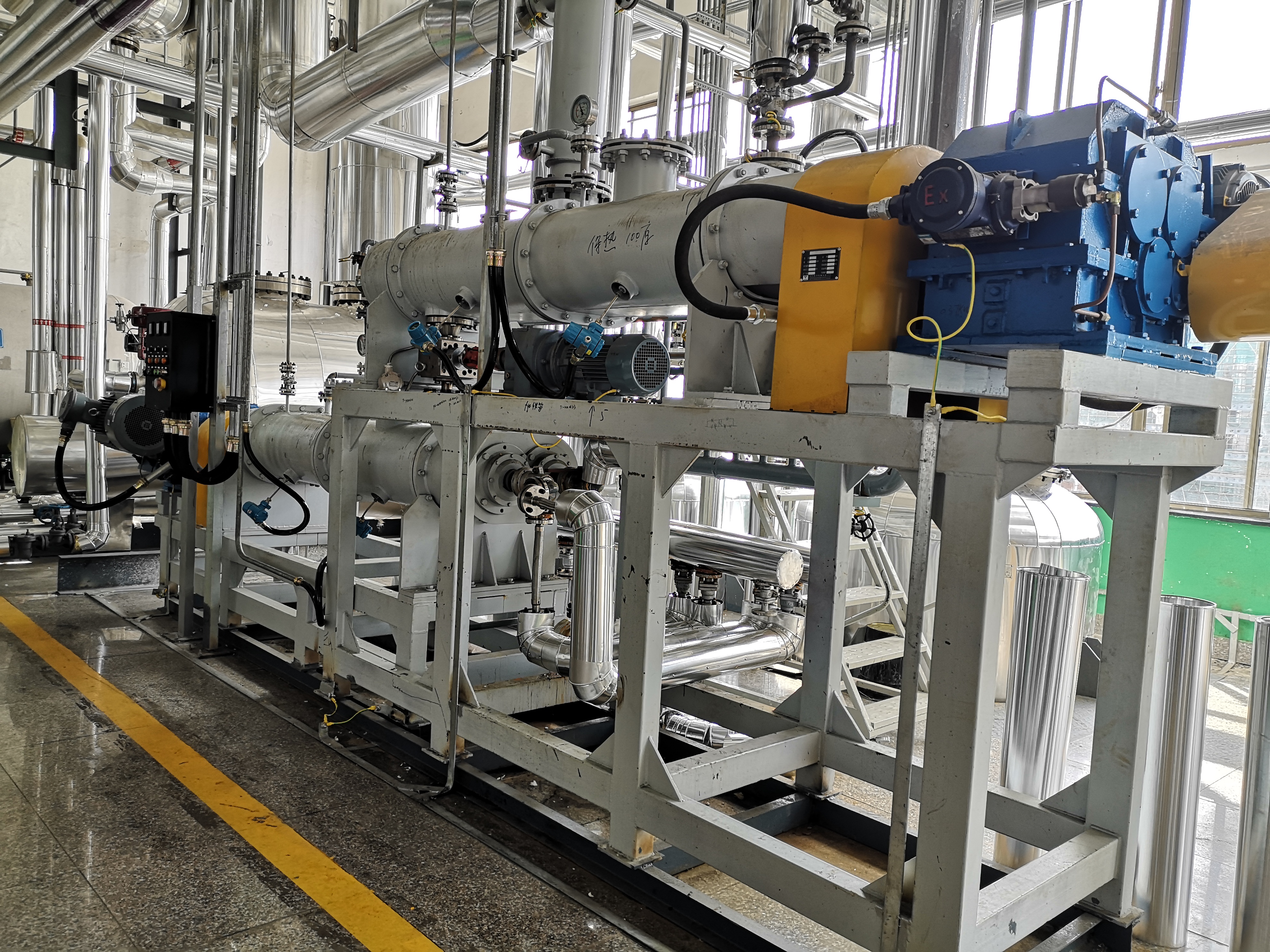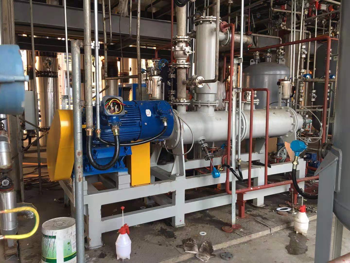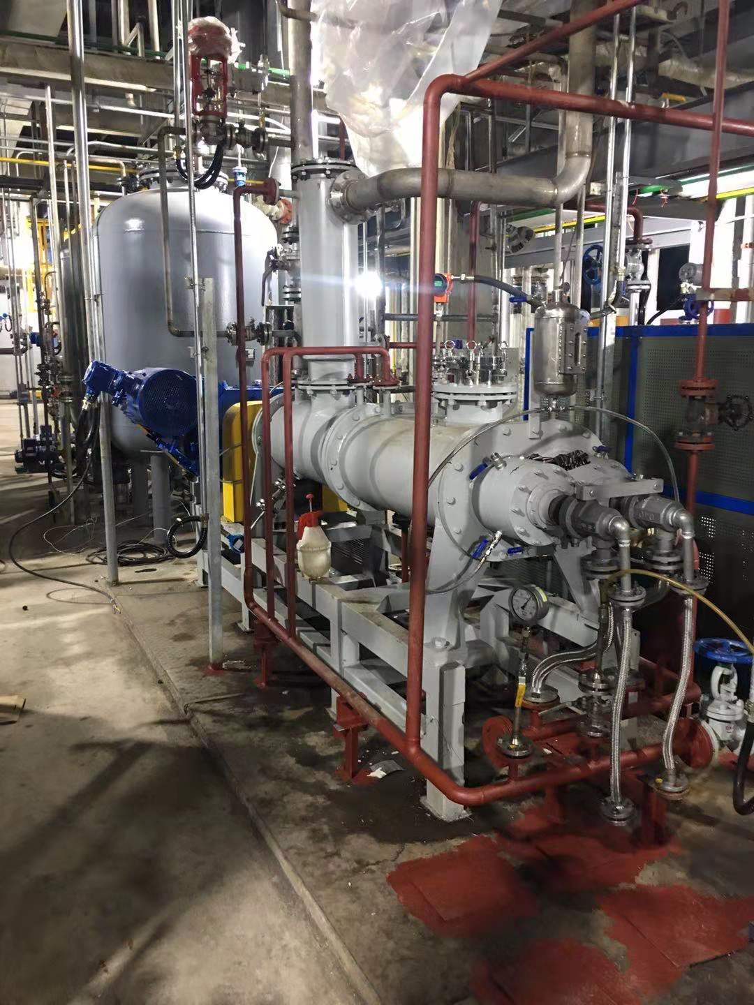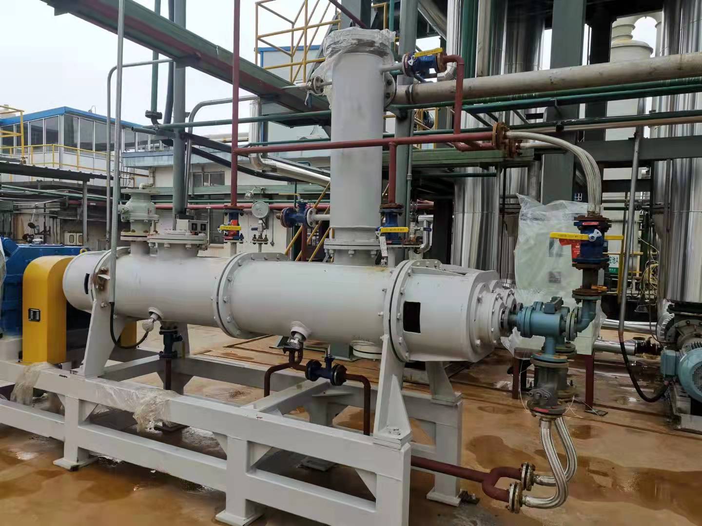 為了適應在真空狀態下的操作,專門安裝了適用于高粘度物料的齒輪泵式出料器。該出料器直接安裝在主設備上,消除了設備內的死角。齒輪泵式出料器在稍微超負荷的條件下工作,以保證物料能連續地排出,并輸入下一工段進行包裝。