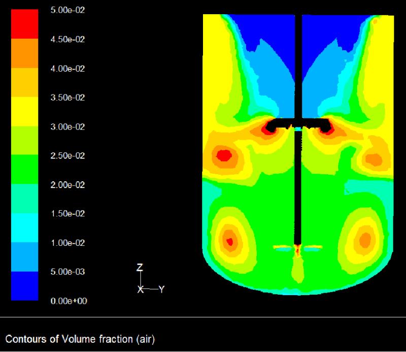 5. 利用下層寬葉仿曲面軸流推進槳大排量的循環,將剛剛噴射出來的氣體,牢牢的壓制在釜體底部,同時也將釜底催化劑固相物料楊起,達到完全懸浮的狀態;